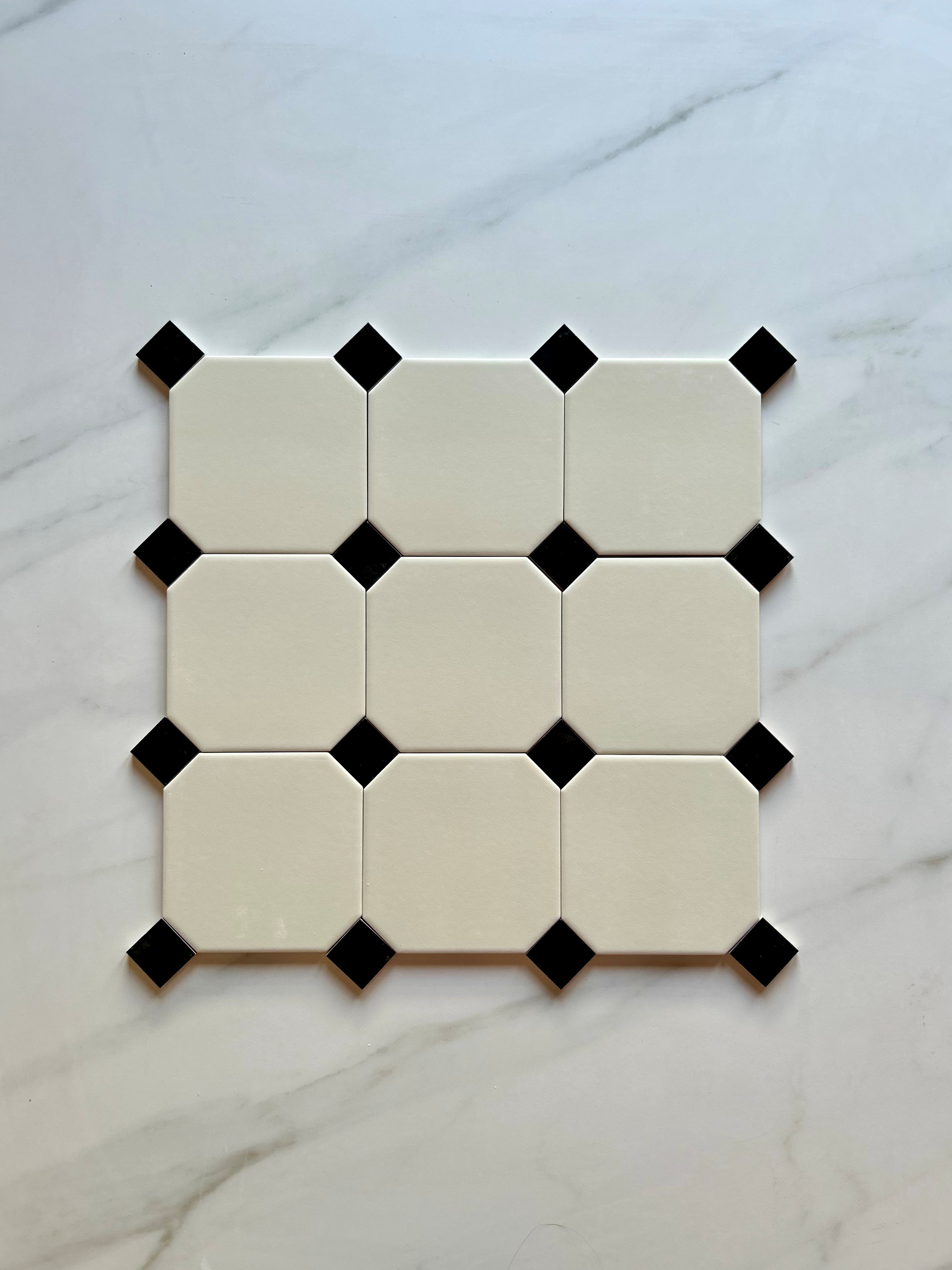 Ge ditt hem en klassisk och tidlös känsla med Oktagon 2 klinker. Beige grundplatta med svart tozzett